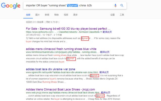 在語(yǔ)句中加入"@gmail" 搜出來(lái)的就都是網(wǎng)站里有g(shù)mail郵箱的網(wǎng)站。