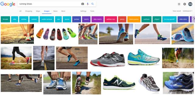 輸入“running shoes”,就會(huì)出現(xiàn)各種跑鞋,眼花繚亂。往下看在圖片結(jié)果的上端出現(xiàn)了一條不同顏色的單詞條,這是Google推薦的篩選細(xì)分類(lèi)目。