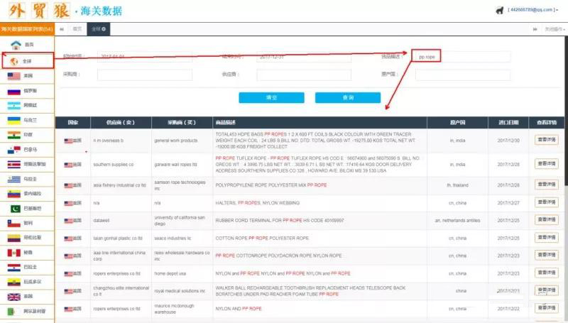 打開了海關(guān)數(shù)據(jù),這里共有52個(gè)國(guó)家+兩個(gè)地區(qū),共54個(gè),選擇對(duì)應(yīng)國(guó)家或地區(qū)(PS:現(xiàn)在外貿(mào)狼升級(jí)了,可以直接一鍵查詢?nèi)虻目蛻簦┲?,可以用貨品描述搜索,也可以用采?gòu)商、供應(yīng)商來(lái)直接搜索,建議用大詞,寬泛一些詞來(lái)搜,如下,我使用關(guān)鍵詞“pp rope”搜索客戶,如下:
