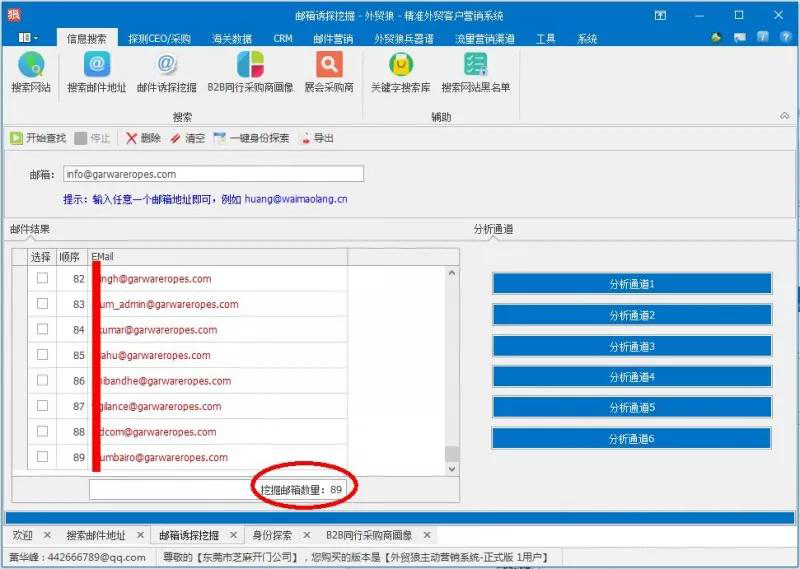 利用外貿(mào)狼的深度挖掘功能和搜索引擎爬蟲技術(shù),快速挖掘出企業(yè)的89個(gè)企業(yè)郵箱。