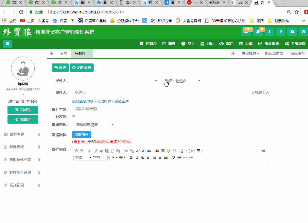 選擇“寫郵件”,自動(dòng)勾選剛剛上傳的聯(lián)系人,然后選擇開發(fā)信模板,選擇簽名,即可輕松發(fā)送郵件!