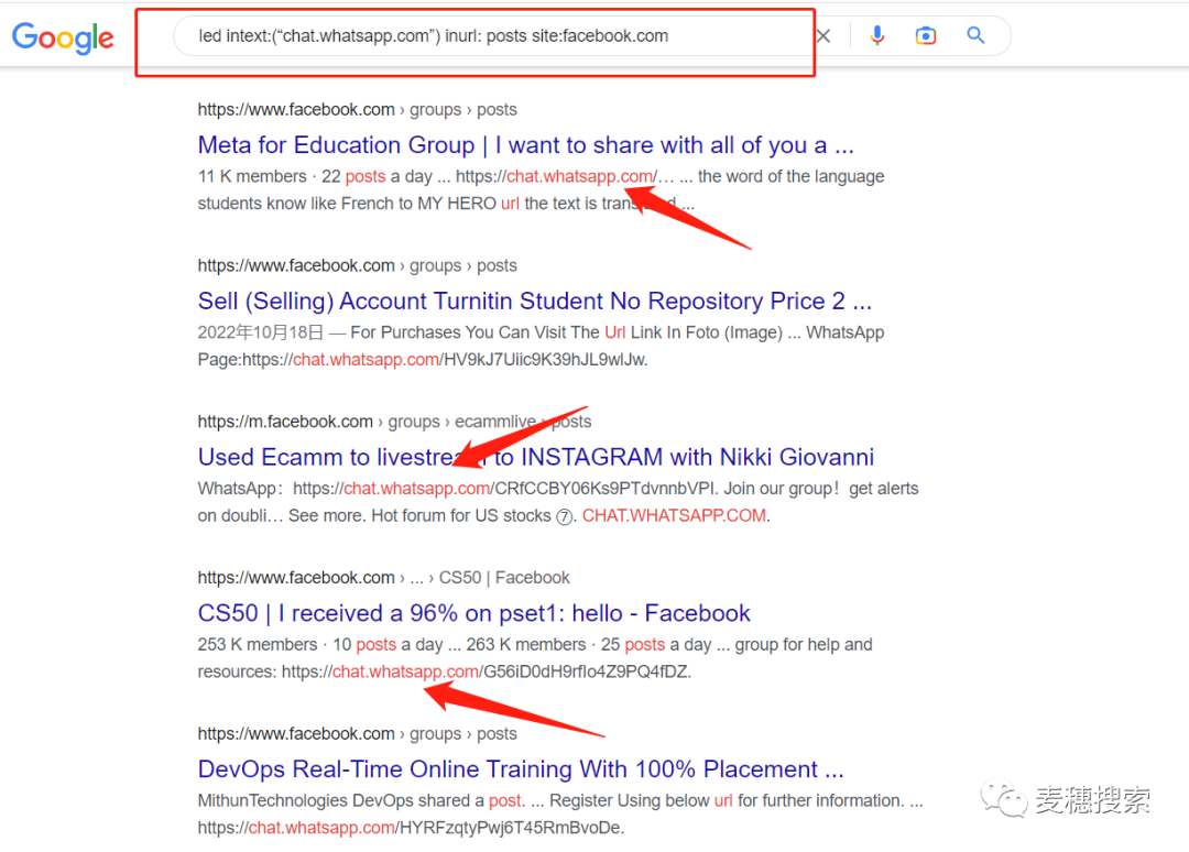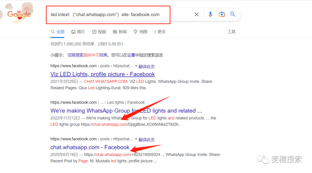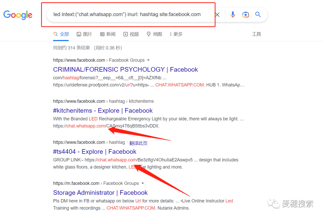 想要更細(xì)節(jié)的話,可以從Facebook的帖子中搜索,可以輸入:led intext:(“chat.whatsapp.com”)inurl:posts site:facebook.com