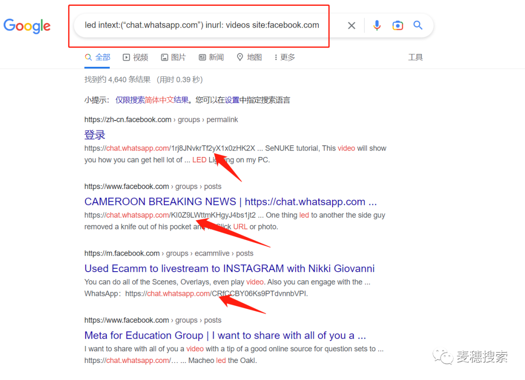 也可以從Facebook的視頻中搜索到WhatsApp群組,可以輸入下面這個(gè)語法:led intext:(“chat.whatapp.com”)inurl:videos site:facebook.com