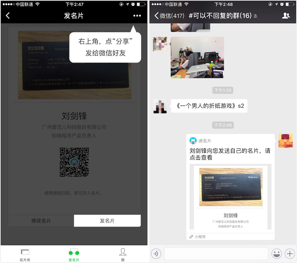 將自己的名片,通過微信分享給對(duì)方。在微信群中,一鍵收集所有人的名片,并向?qū)Ψ椒窒碜约旱拿?。與對(duì)方見面時(shí),互相掃描對(duì)方的名片二維碼。